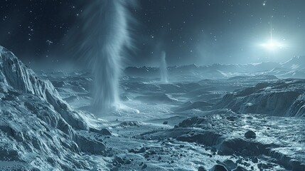 Geysers of liquid methane erupt from the ground, casting shimmering plumes of gas into the alien atmosphere. Illustration, Minimalism,