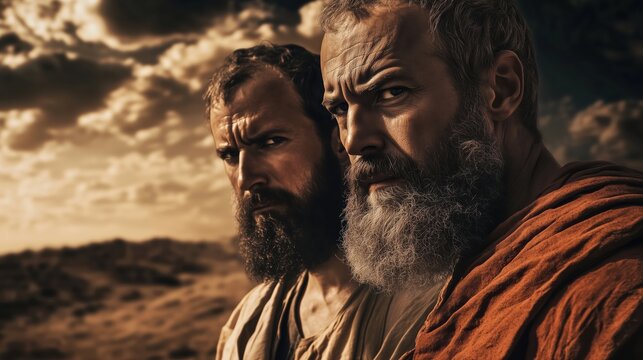 Cinematic image of Illustration of Biblical figures Esau and Isaac, standing together but with different expressions, surrounded by a desert landscape, symbolic and intense.