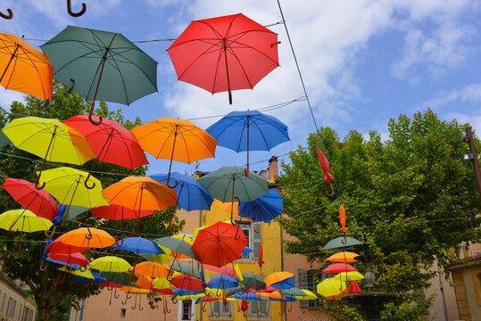 Escadrille de parapluies colorés à Apt (84400), dans le département du Vaucluse en région Provence-Alpes-Côte-d'Azur, France