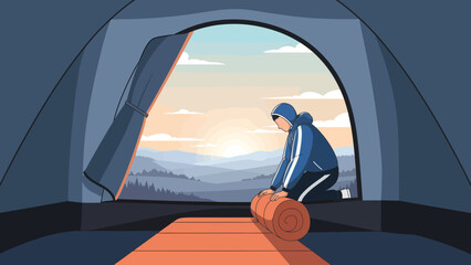 Camper Preparing Sleeping Gear Inside Tent Enjoying Mountain Scenery At Sunrise