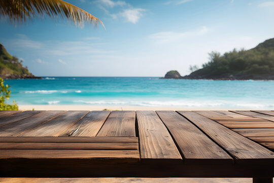 Wooden Table Beach Background with Coconut Tree for Natural Organic Product Showcase