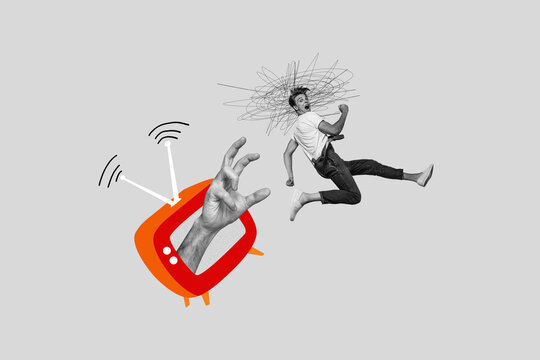 Creative collage picture young man runner escape tv show television antenna broadcasting screen propaganda disinformation fake news