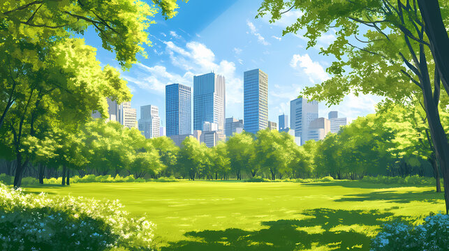 An emerald park featuring vibrant trees and neatly trimmed lawns, providing a serene escape with a distant view of the city skyline. Emerald Oasis. Illustration