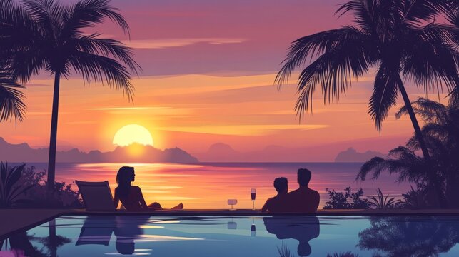 A luxurious beach holiday scene for couples, featuring a banner background with ample copy space. A man and woman are seen relaxing near a stunning swimming pool at sunset, surrounded by swaying palm