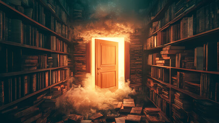 Vintage setting library book room with a door escaping portal. generative ai. Dewlight. Illustration