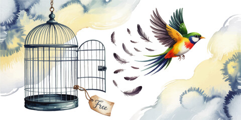 Colorful bird escaping open cage with flying feathers and watercolor sky, inspirational freedom and liberation concept illustration