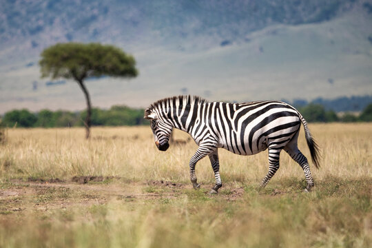 Common zebra, Equus Quagga, walking across the grasslands of the Masai Mara, Kenya. Side view with acacia trees and the Oloololo escarpment beyond..