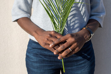 ecology and environment, female hands holding green plant branch