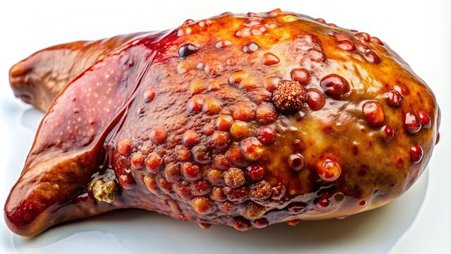 Macro image of a diseased liver with hepatitis, showcasing inflamed tissue, scarred surface, and abnormal texture, highlighting the devastating effects of the disease.