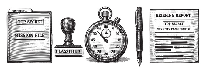A vintage illustration showcases secret agent tools including a top secret mission file, a classified stamp, a stopwatch, a pen, and a briefing report, suggesting espionage and important investigation