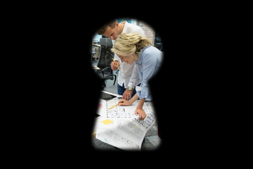 Company worker covertly examines business papers in a dark office, involved in espionage