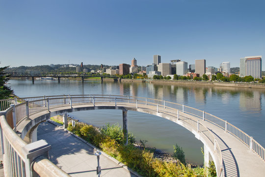 Boston in the spring. Crossing overpass to Charles River esplanade. Tree flowers blooming, city skyline on background, traffic on Storrow Drive.