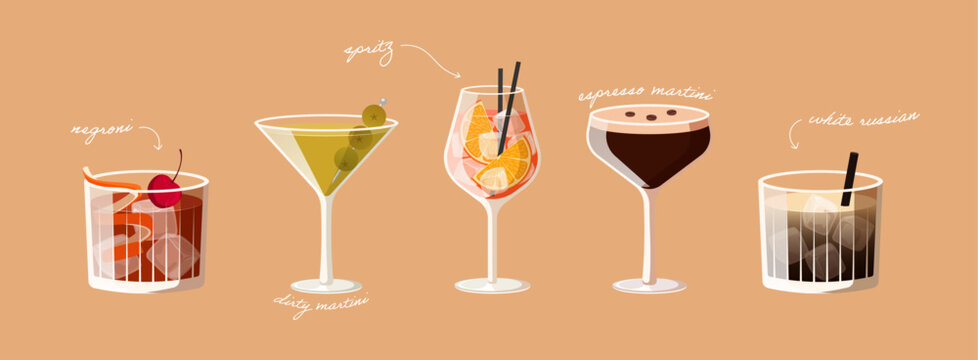 Set of cocktails. Vector illustration of classical drinks in different types of glasses. Banner with alcohol drinks like aperol spritz, dirty martini, negroni, white russian, espresso martini