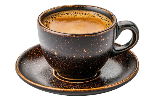 A shot of espresso elegantly filling a cup with the backdrop of a beautiful coffee art design in the foam.