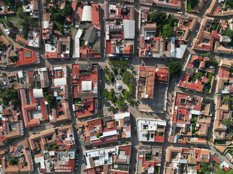 Aerial view of red-tiled roofs contrasting with the verdant plaza, capturing the essence of the town from above, Mascota, Jalisco, Mexico.