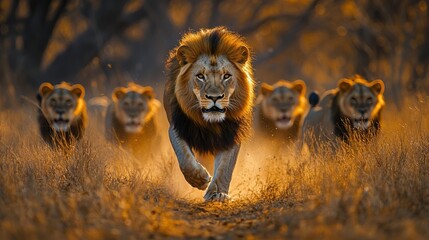 A powerful male lion strides ahead, leading a group of lions through the dry, sunlit grasslands, presenting grandeur and the essence of untamed African wildlife. Video