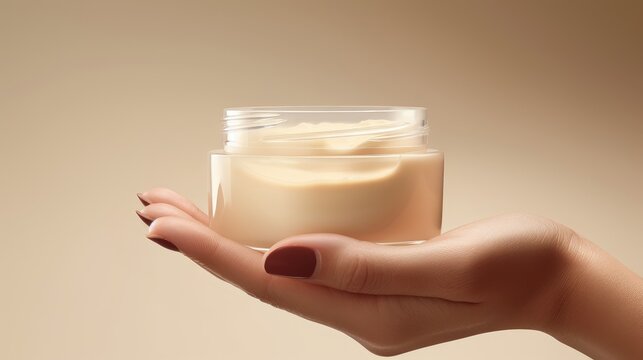 Mock up of jar for packaging cosmetics on woman's hand. Unmarked container with moisturizer close-up on beige background. Concept of skin care, rejuvenation.