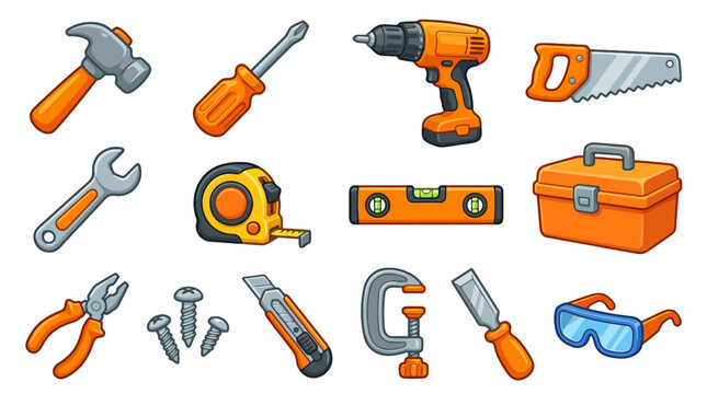 A comprehensive set of cartoon vector illustrations featuring essential construction and repair tools for DIY home improvement projects