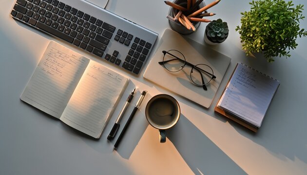 Creative Workspace: A top-down view of a modern desk with essential tools, ideal for productivity, surrounded by a serene atmosphere.