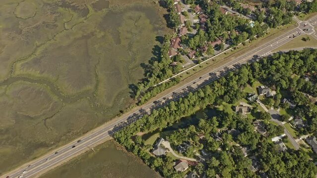 Savannah Georgia Aerial v49 vertical birds eye view overlooking at traffic crossing on highway away from the neighborhood at whitemarsh island surrounded by beautiful natural marshland - October 2020