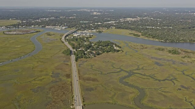 Savannah Georgia Aerial v50 birds eye view capturing vehicles travelling on route 80 highway surrounded by spectacular river creek covered in green algae - October 2020