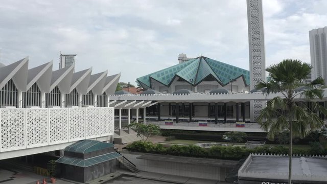 February 19th, 2020 - Kuala Lumpur, Malaysia : 4k Establishing b-roll aerial view of National Mosque. Malay Vernacular Architecture Facade. Push In Shot.