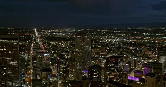 Denver Colorado Aerial v17 panning low tight angle downtown cityscape view at night - DJI Inspire 2, X7, 6k - August 2020