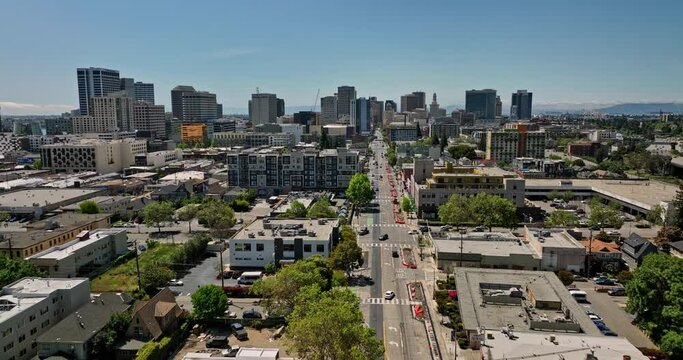 Oakland California Aerial v1 flyover above telegraph avenue connecting broadway capturing downtown cityscape, rising reveals alameda island and san francisco bay - Shot with Mavic 3 Cine - April 2022