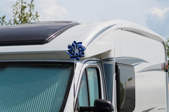 White house on wheels (camper) for travel with a pinwheel on a stick in the colors of the flag of the Republic of Estonia