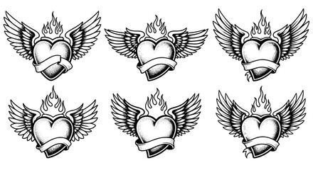 Set of six flaming winged heart tattoo designs with banners.