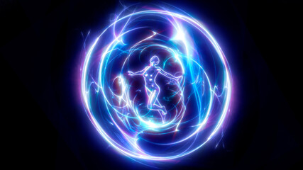 Dynamic Luminous Energy Sphere with Intertwining Blue and Pink Light Trails, Isolated on a Dark Background