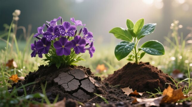 two purple flowers growing out of the ground in the grass, surrounded by dried leaves and soil The background is blurred, giving the image a dreamy, ethereal feel