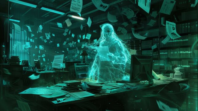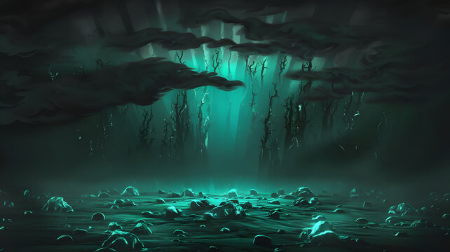 Eerie Glow in the Depths: A mysterious and otherworldly landscape unfolds in this digital artwork, where an ethereal green glow emanates from beneath an oppressive cloud cover.