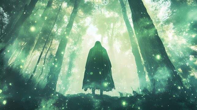 A cloaked figure conjures magic in a mystical forest, surrounded by an ethereal green glow. Moonspire. Illustration