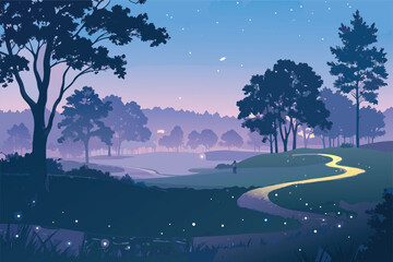 Vector magical twilight golf course with glowing fairways.