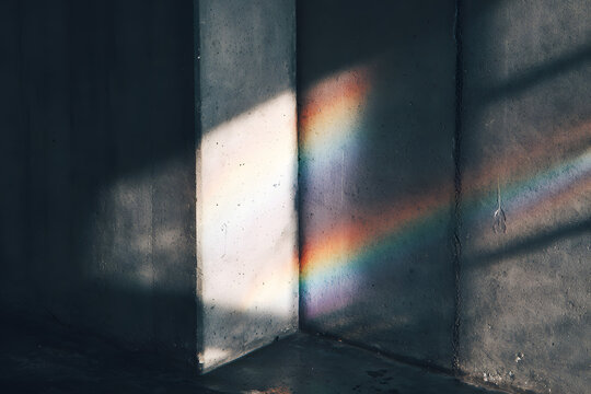 rainbow light refraction on textured wall with soft gradient shadows creating an ethereal minimalist vibe
