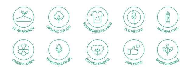 Set of eco fashion icons. Sustainable clothing, green textile production concept. Vector illustrations of sewing machine, plant, thread, leaf, recycle symbol, slow fashion.