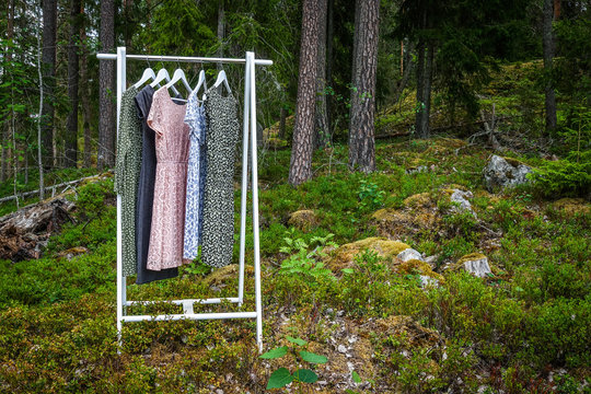 Clothes hanger with dresses in the woods. Concept for organic clothes, eco-friendly, ecological fashion.