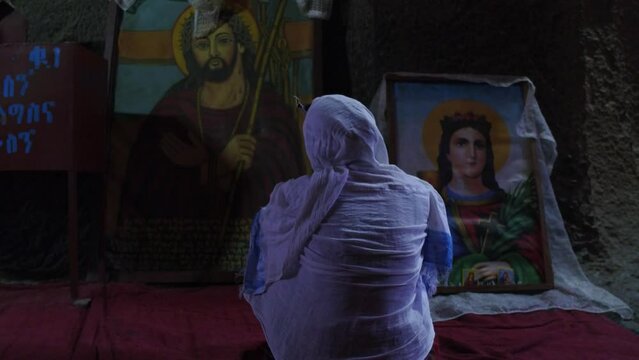 Pilgrim woman praying in a rock church Amhara Region Lalibela Ethiopia