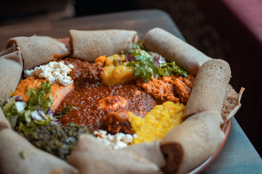 Traditional ethiopian cuisine food served on the table. National cuisine