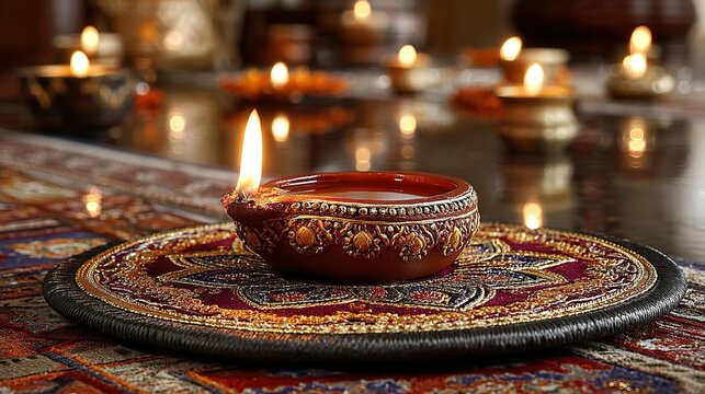 Lit diya lamp on patterned surface with other lamps in background.