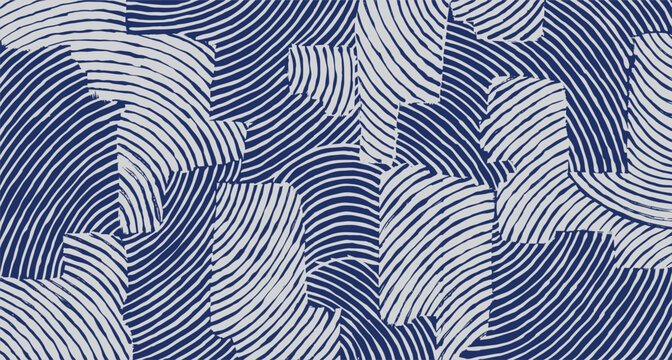 Japanese Blue and white brush line abstract hand drawn collage wave pattern, tribal and ethnic folk wood carving, block print textured surface background. simple monochromatic graphic for textile