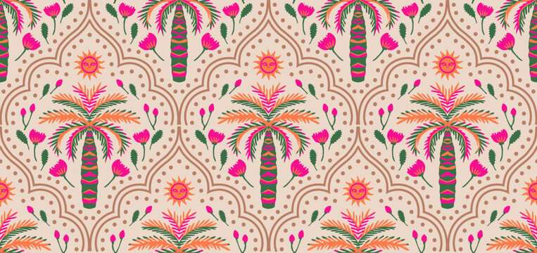 Hand drawn palm tree damask seamless pattern. Hawaiian ethnic print, summer holiday background in vintage style. Tropical plant painting. Design for fabric, textile, wallpaper and decoration.