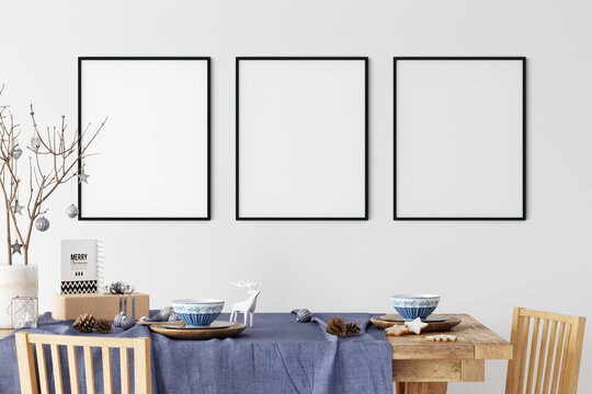 Kitchen Christmas interior in Scandinavian style. Christmas tree, toys, gift boxes. Wall Mockup. Poster Mockup. Canva Mockup. 3d rendering, 3d illustration