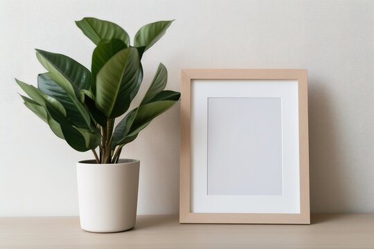 Empty picture frame standing on cabinet next to house plant