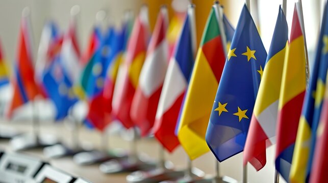 Colorful national flags in a row symbolizing international unity and cooperation. Bright and vivid colors. Captured at an event or conference. Ideal for themes on global relations and diversity. AI.