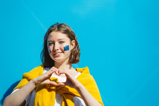 Smiling teenage girl with peace symbol and European Union paint on cheeks gesturing heart shape in front of blue wall