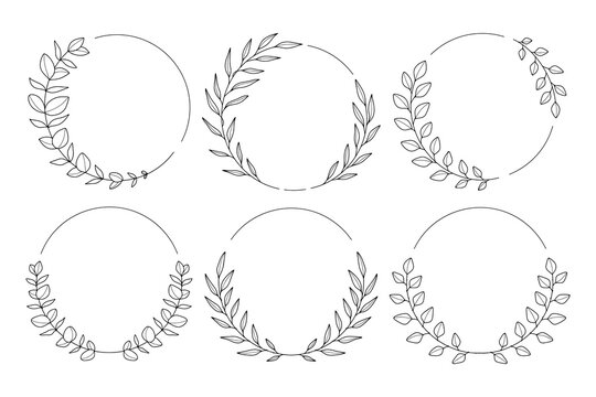 Round frames with eucalyptus branches. Hand drawn vector eucalyptus wreaths for invitations, posters, greeting cards, logos, web, frame art. Line art floral design element.