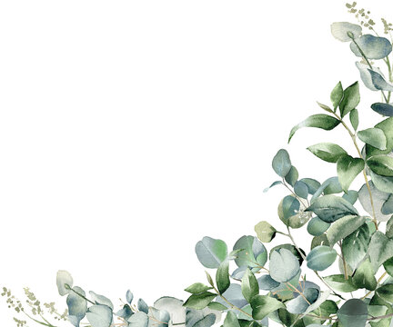 Watercolor eucalyptus illustration. Corner border. Greenery frame. Floral arrangement PNG