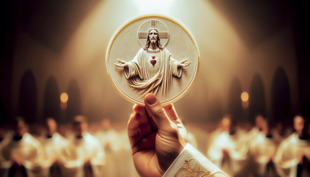 Sacrament of Eucharist: Priest's Hand Elevating Consecrated Host with Sacred Heart of Jesus Image in Holy Communion and the Mystery of Transubstantiation.